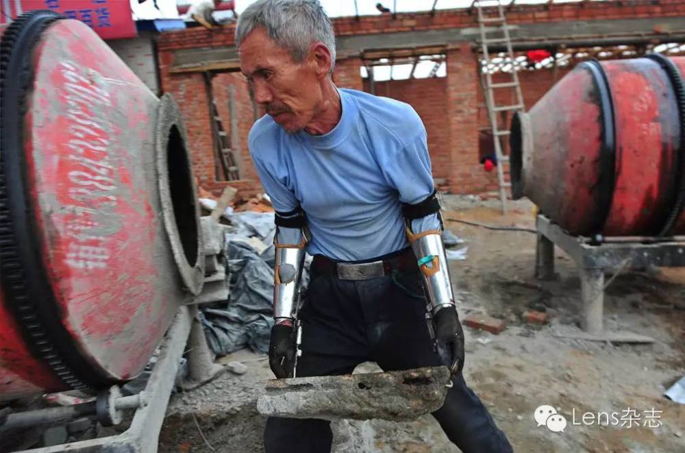 2012年9月25日,一位名叫孙吉发的残疾农民在搬砖头建新房。 32年前,他在一次爆破意外中失去了前臂。负担不起高额假肢费用的他,便花了两年时间指导两名侄子利用非金属、塑料和橡胶自制假肢。