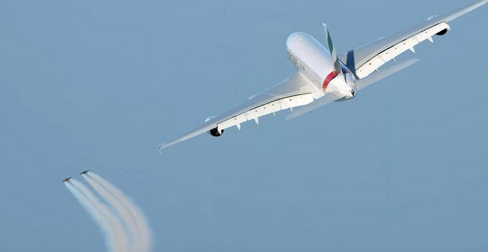 标题: 牛!迪拜喷气“飞人”与全球最大客机高空共舞