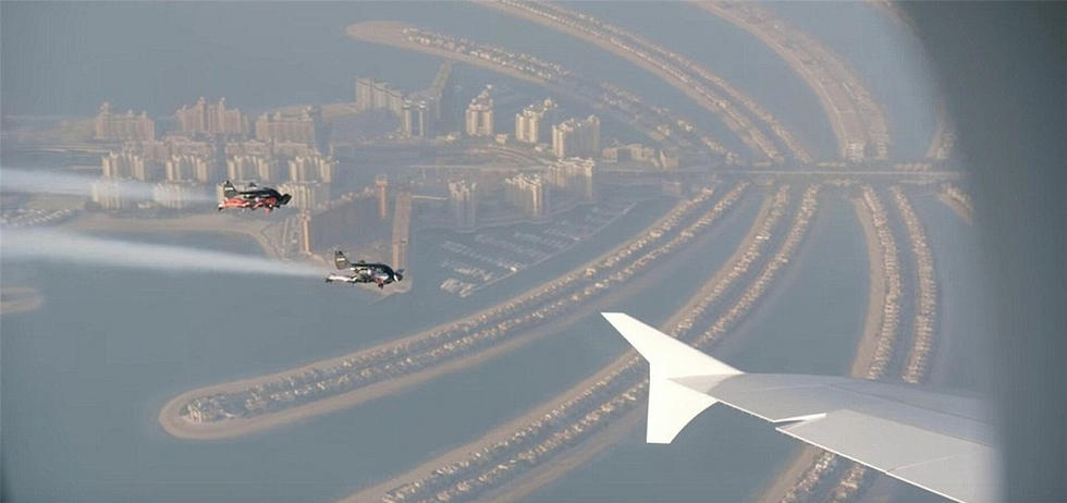 这已经不是两位喷气翼人的首次飞行了。今年五月,他们以200公里的时速飞越迪拜,在高空近距离感受这座城市的地标建筑,其中就包括哈利法塔;去年十二月,Rossy和特技飞行冠军Veres Zoltan在迪拜沙漠1500米上空进行了一次联合表演。