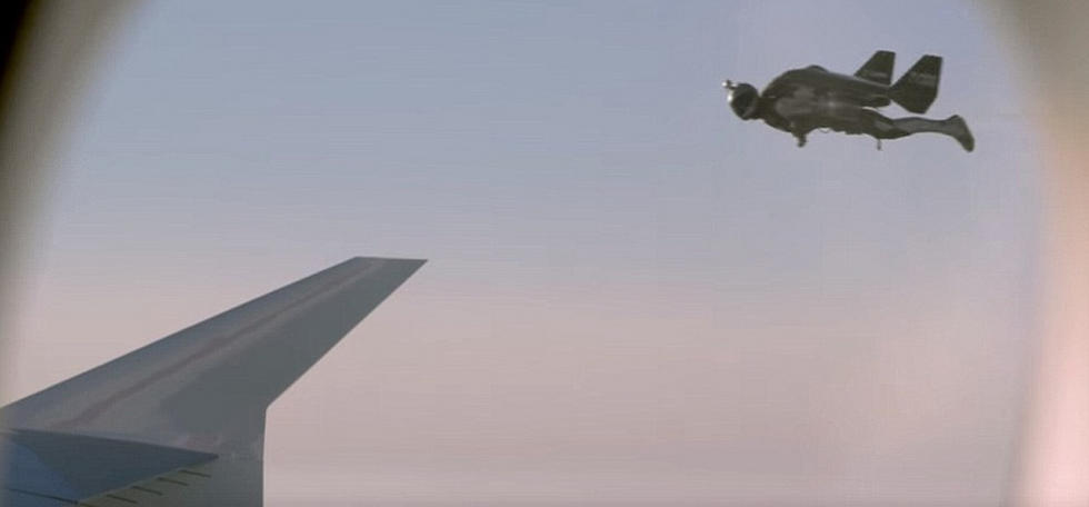 两人从一架盘旋在将近1700米高空的直升机中释放,分别在客机两侧进行编队飞行,之后先集中然后再次分开。