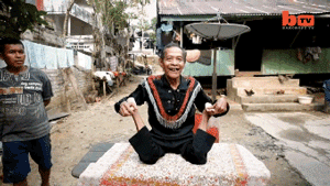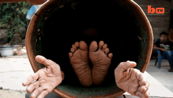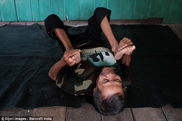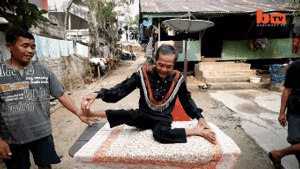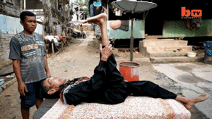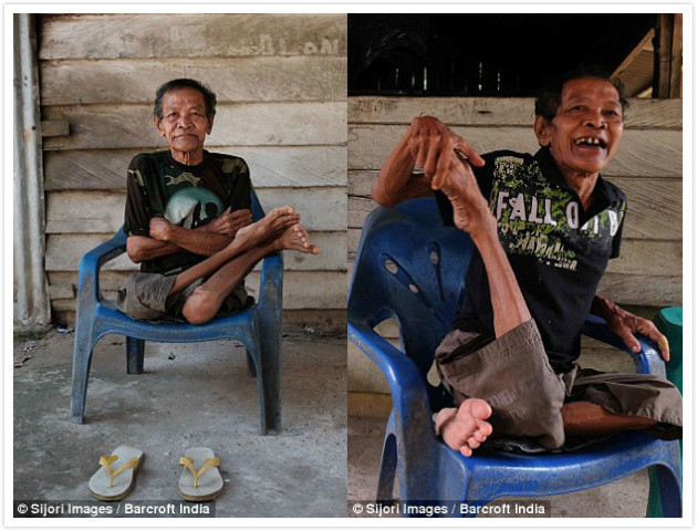 大爷名叫Mbah Bejan,今年68了,来自印度尼西亚北加里曼丹省。他可以轻轻松松把自己对折起来,钻进一根50厘米粗的管子里: