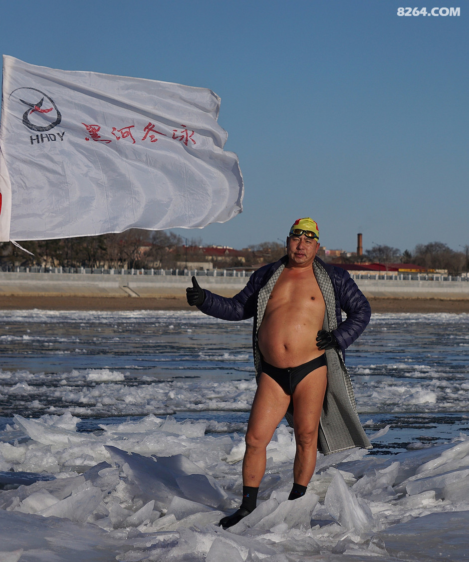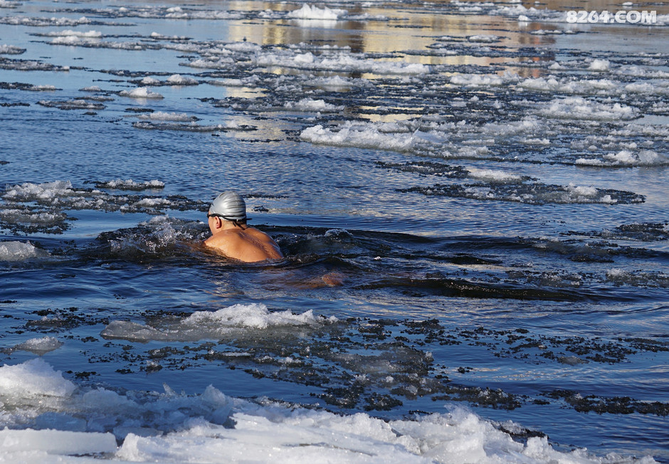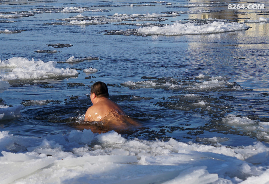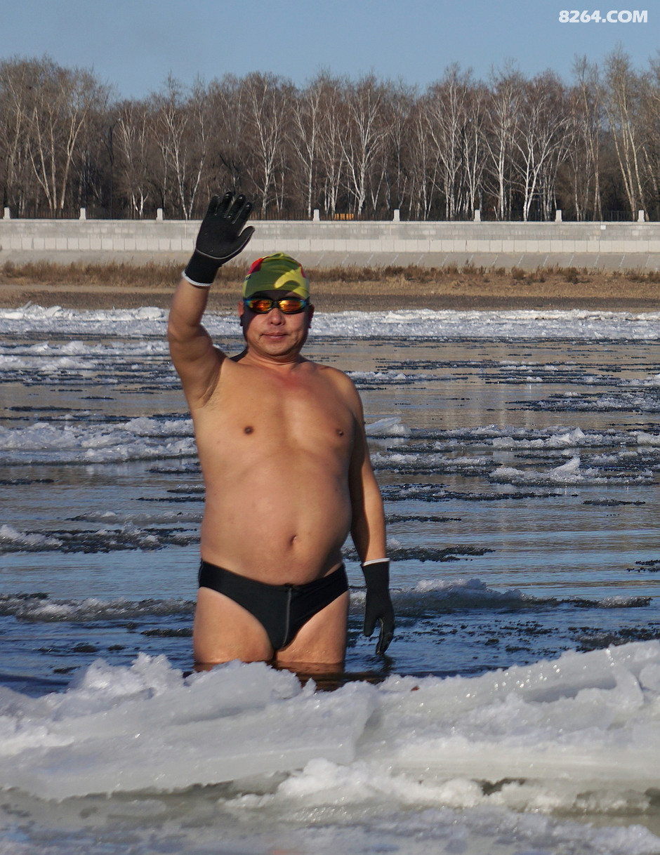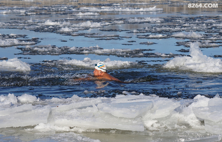 度多一点,大片的冰排一直不停的泄着。我们黑河冬泳队的勇士们,不畏艰难困苦,在黑龙江中畅游,在冰排的缝隙间穿梭。他们中最大的是8