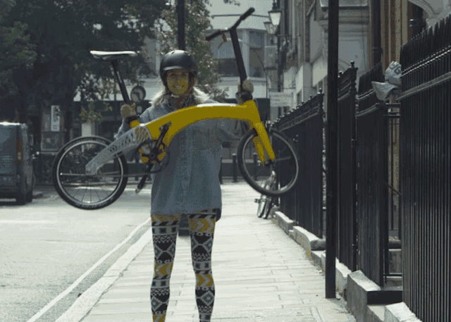 后轮和前方的车架可以折叠收入整个框架中,亦可以调整座椅的高低,纵向折叠的方式方便骑行者携带其乘坐地铁或是电梯等,自如穿梭在公共场合。