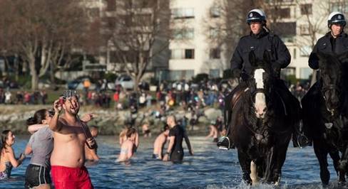 ! ^0 v: `" L) H# X 温哥华的英吉利海湾(English Bay),冬泳者在冰冷海水中跳舞,温哥华的北极熊俱乐部 (Polar Bear Club)成立于1920年,是加拿大历史最悠久、规模最大的“北极熊俱乐部”。该俱乐部在1920年的元旦组织了第一次冬泳,今年已经是第96届: