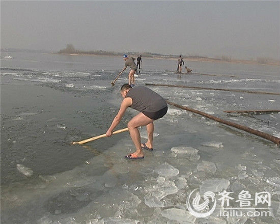 大家仅穿着游泳裤、游泳衣便跳入冰冷刺骨的湖水中,厚度达两三厘米的冰层漂浮在他们身边。