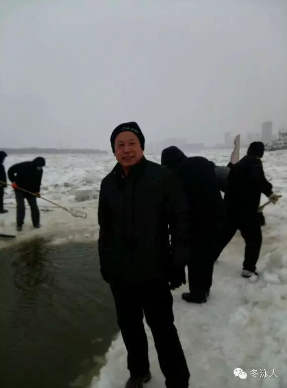 冬泳队员不畏严寒,为保证松花江上冬泳池的流畅不被冰封,大家齐心协力,铲冰的铲冰,涝冰的涝冰