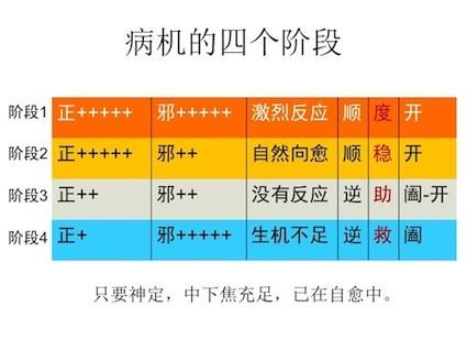 如果你的正气比较足,你能够激烈反应。所以有时候当你生病的时候,看起来是很痛苦,其实是你身体能量很高,这是第一点;第二点,如果你看起来身体很好,平常没有什么不舒服,也没什么反应,有可能你在第三或第四阶段。还有你去看医生,最后把很多症状都处理完了,没有症状了,以为成功了,但是有可能你原来身体在第一或第二阶段,最后经过“治疗”,你到了第三或第四阶段了。