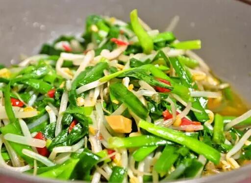 绿豆芽锅内油热后,放入绿豆芽,炒一分钟后,加入盐。绿豆芽变透明色后,放入少许醋,放入切好的韭菜苔爆炒。
