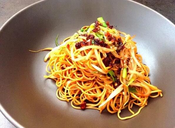 食材:面条,豆芽,胡萝卜,小葱,盐,干辣椒,酱油