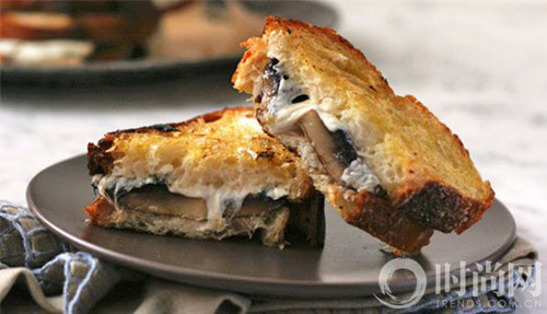 将烤过的褐蘑菇和洋葱放在意大利硬面包上,然后再加一层蔬菜,撒上三种芝士(马苏里拉、意大利乳清和奶油芝士)。口感香浓!