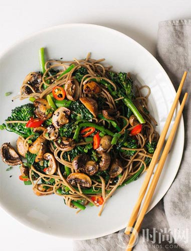 将烤过的蘑菇放在照烧汁里浸泡会儿,然后拌着荞麦面,口感丰富的照烧汁儿带给你