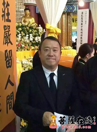 永惺老和尚法像被白菊花包围,旁边还有水果和糕点。追思会上,曾志伟双手合十,一直低头默哀、祈祷,可以看得一脸伤心、难过。祈愿老和尚不舍众生、乘愿再来。