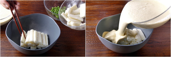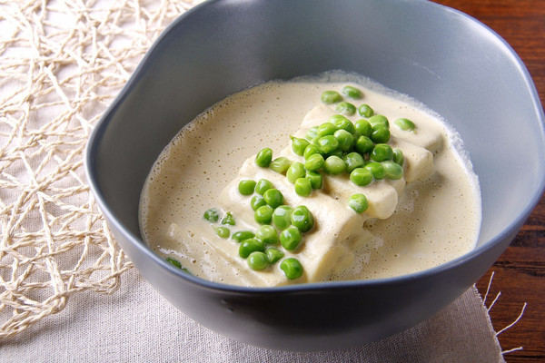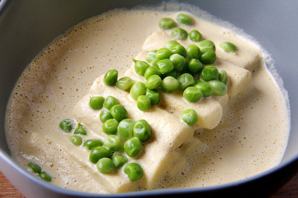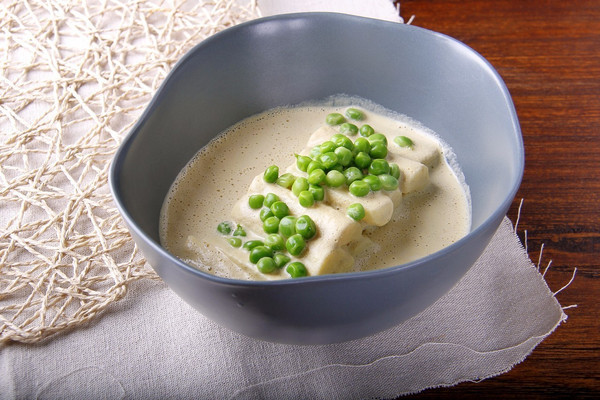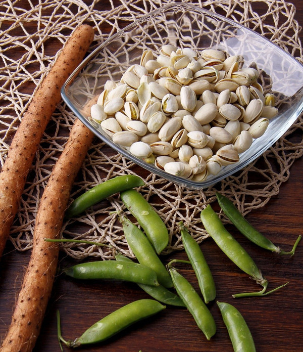 7. 将山药夹入碗中,淋上开心果汁,撒上豌豆粒,即可食用。