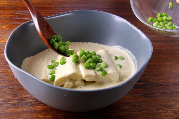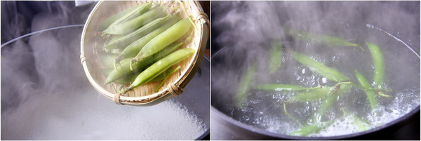 6. 随后将豌豆入锅,煮熟后沥干水分捞出,然后将豌豆粒挤出;