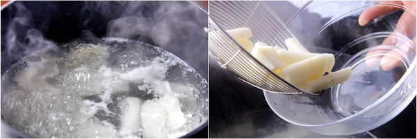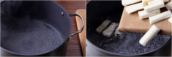 5. 锅中煮水,水开后倒入山药段。煮熟后沥干水分捞出;