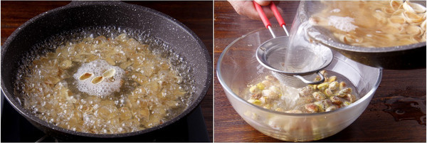 3. 锅中放水,将开心果壳入锅煮至水开后5分钟,滤掉果壳,将煮果壳的水与果仁混合;
