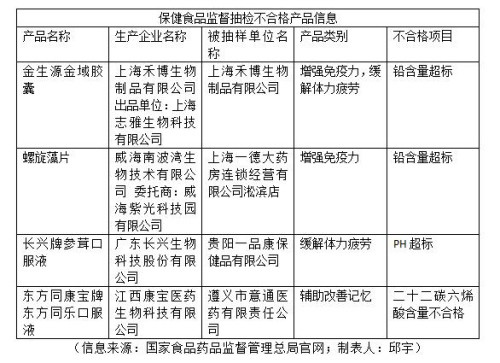 记者注意到,今年以来,辽宁、天津、上海、贵州等多地发布了保健食品监督抽检情况通告,在“抽检不合格产品”中就包括一些自称能增强免疫力、缓解体力疲劳的保健品,例如部分金生源金域胶囊、螺旋藻片等被检测为铅含量超标。