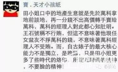 著名二代、花样年老板曾宝宝发微博炮轰过田小姐这样挣万科的钱:先于万科拿地前谈地,再一分钱不出高价转手卖给万科,“自古婊子的最大核心能力不是独立,是跪舔,只是田小姐更多了些时代的烙印,所谓互联网的精神,不要脸的精神。”
