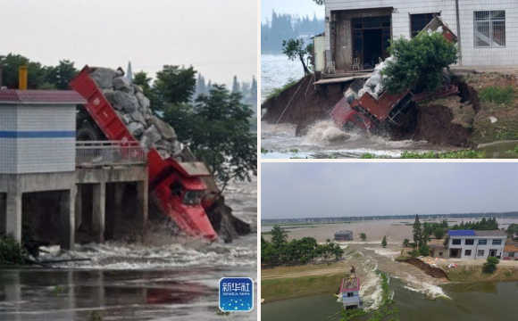 7月10日上午,湖南省华容县新华垸发生重大管涌险情,红旗闸附近出现溃口。危难之际,十几辆满载麻石的卡车在大堤两边一字排开,以连车带石的方式驶入溃口堵住滚滚洪流。这群驾驶员被人们称为“卡车敢死队”。