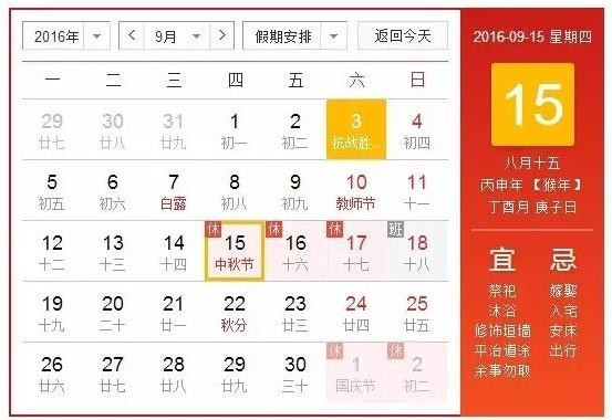根据国务院办公厅通知精神,今年中秋节休假三天,9月15日(星期四,中秋节)至9月17日(星期六)放假调休,9月18日(星期日)上班。尽管重大节假日免费通行的国家政策已经执行5年了,但仍有不少市民并不清楚中秋节、端午节并不在免费的节假日范围内。省交通部门相关人士表示,2012年曾出现过中秋节和国庆节连休的情况,由于国庆长假属于免费通行时间,因此中秋节享受了免费通行。但根据《重大节假日免收小型客车通行费实施方案》,免费通行时间为春节、清明节、劳动节、国庆节四个国家法定节假日以及当年国务院办公厅文件确定的上述法定节假日连休日。根据这一规定,中秋节并不在高速公路免费通行的节假日内。这意味着,这个中秋节小长假高速公路不免费,车主们想要免费走高速需要等到国庆长假。