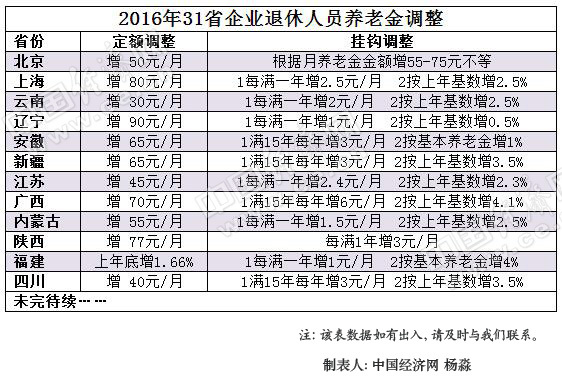 以云南为例,缴费年限每满一年每人每月增加2元,再按本人2015年12月基本养老金的2.5%增加调整。安徽规定,缴费年限满15年后满一年每人每月增加3元,再按本人2015年12月基本养老金的1%增加调整。中国经济网统计,已公布方案省份,大多以此进行挂钩调整。