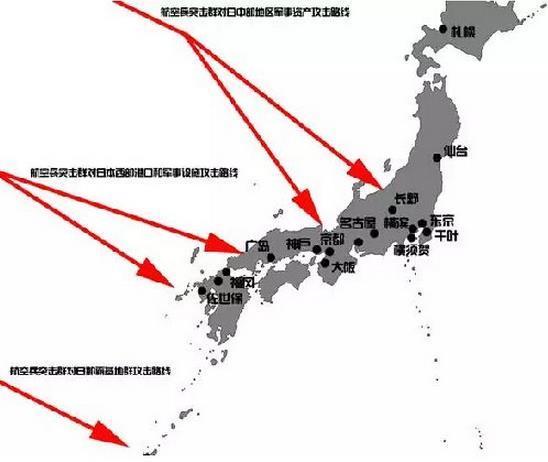 显示的是航空兵部队突击日本本土时的攻击路线图