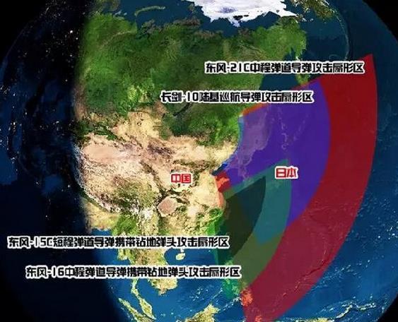 从西面和东面对日本本土南部形成包围,利用对陆攻击巡航导弹和潜射反舰导弹打击关键目标。火箭军导弹的攻击扇面,从携带钻地弹弹头的东风15,东风16短程弹道导弹,到东风21中程反舰弹道导弹。还有长剑10巡航导弹。