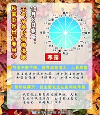 这一天,北京地区白昼时长已缩短至11小时29分钟,正午太阳高度已降低至44°09'。寒露过后,太阳高度继续降低,气温逐渐下降。白露、寒露、霜降三个节气,都表示水汽凝结现象,而寒露是气候从凉爽到寒冷的过渡。夜晚,仰望星空,你会发现星空换季,代表盛夏的"大火星"(天蝎座的心宿二星)已西沉。我们可以隐约听到冬天的脚步声了。