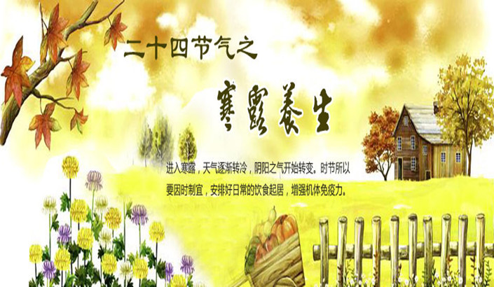 寒露的到来,气候由热转寒,万物随寒气增长,逐渐萧落,这是热与冷交替的季节。在自然界中,阴阳之气开始转变,阳气渐退,阴气渐生,我们人体的生理活动也要适应自然界的变化,以确保体内的生理(阴阳)平衡。这时饮食要以滋阴润燥为主,润燥多汁的水果是养生首选。每年的10月8日前后(10月8日~9日),太阳移至黄经195度时为二十四节气的寒露。“寒露”的意思,是此时期的气温比“白露”时更低,地面的露水更冷,快要凝结成霜了。《月令七十二候集解》:“九月节,露气寒冷,将凝结也。”如果说“白露”节气标志着炎热向凉爽的过度,暑气尚不曾完全消尽,早晨可见露珠晶莹闪光。那么“寒露”节气则是天气转凉的象征,标志着天气由凉爽向寒冷过渡,露珠寒光四射,如俗语所说的那样,“寒露寒露,遍地冷露”。