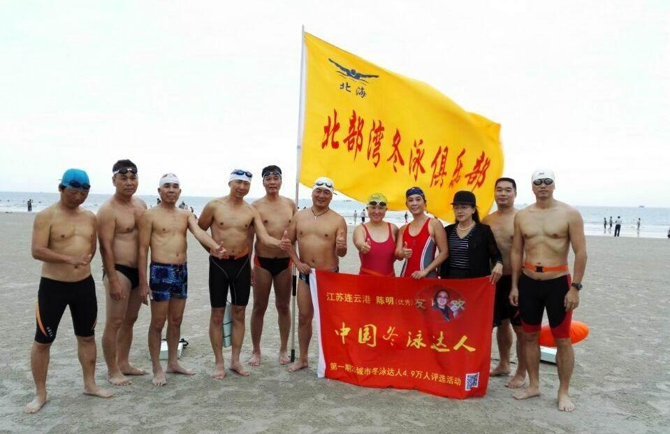 2016年11月7日,获得“中国冬泳达人”称号的香港冬泳总会江苏分会会长陈明抵达北海访问,与北海北部湾冬泳俱乐部队员交流冬泳经验。北海北部湾冬泳俱乐部法律顾问徐律师、副会长林师傅、天空,银滩游泳队长唐古拉等队员陪同陈明会长畅游了银滩海域。