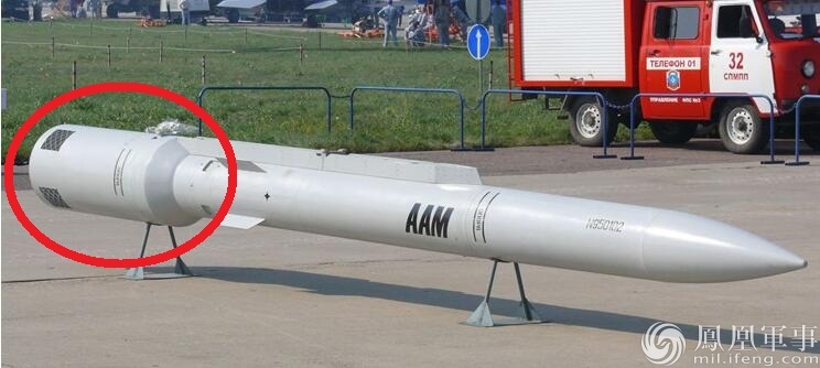 为解决火箭发动机加速时燃料消耗过快而影响射程的问题,KS-172导弹加装了大于弹体直径的冲压助推段(红圈处),但该结构对战机的挂载与发射较为不利。(凤凰军事)