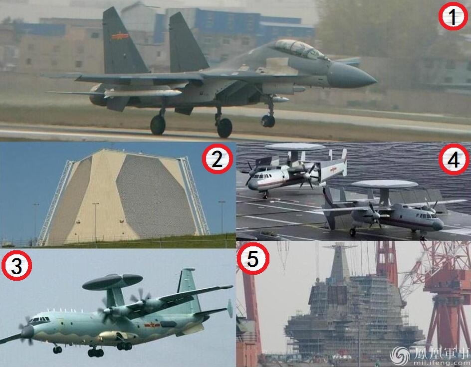在中国反制“美式饱和打击”的体系中,配备远程空空导弹的歼16(①)不仅是拦截力量,更能为航母编队提前预警,在该过程中,陆基(②③)与舰载预警(④)、保障、指挥体系(⑤)将提供至关重要的系统保障。(凤凰军事)