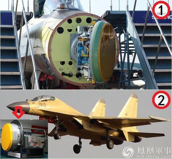 与苏35配备“雪豹”E无源相控阵雷达(①)以发挥KS-172作战能力类似,歼16从一开始就配备了国产有源相控阵雷达(②),无论是对隐身目标的有效探测距离还是探测精度,都将明显优于俄式雷达。(凤凰军事)