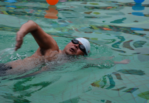 大家换好泳装后,首先站在泳池起点上,用凉水把身体打湿适应水温,随着工作人员一声哨响,纷纷“扑通”跳入泳池,自由泳、蛙泳、仰泳……