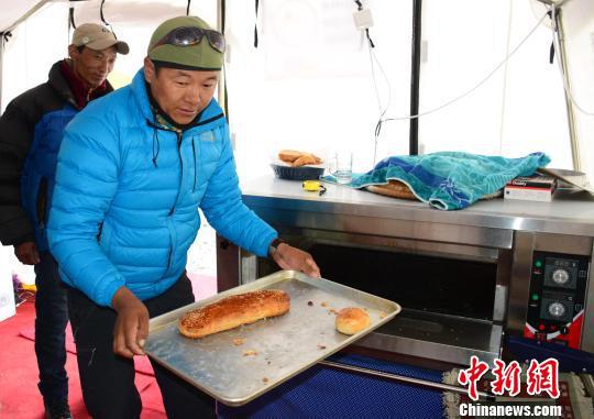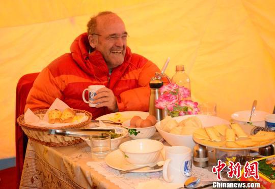 64岁的凯瑞·库伯拉(Kavi Kobler)来自瑞士,今年是他第17次带领登山团队进藏。图为正在享用早餐的库伯拉,面包、法国芝士、鸡蛋、咖啡等均是通过电器现做。 陈韬彬 摄