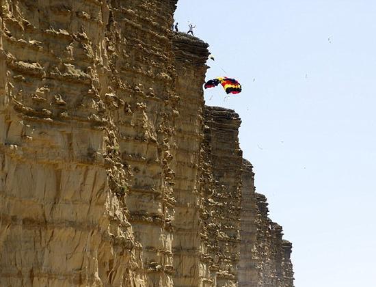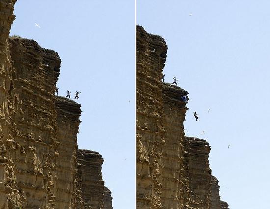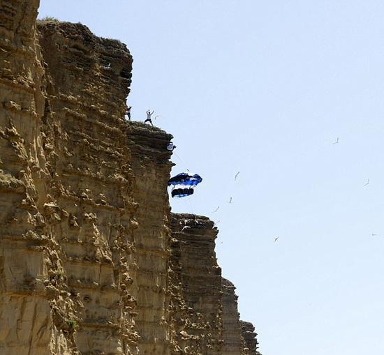 这三名寻找刺激的少年选择了英国多塞特郡一处高约45米的悬崖进行跳伞。现场视频中,三位少年相继从悬崖边跳下,而第四个人在他们后边拿着降落伞。因为悬崖高度低,所以他们没法自己打开降落伞,于是就让第四个人将降落伞提前展开,等待他们跳出去的那一刻再打开。他们每个人从悬崖顶降落到沙滩上大约花费了6秒时间,据现场群众反映,当他们三个人从悬崖顶上离开的瞬间有大量石头滚下,十分危险。当警察和海岸警卫队赶到现场时,这些“作死”少年早已离开现场。