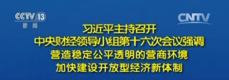 央视网消息 (新闻联播):中共中央总书记、国家主席、中央军委主席、中央财经领导小组组长习近平7月17日下午主持召开中央财经领导小组第十六次会议,研究改善投资和市场环境、扩大对外开放问题。习近平发表重要讲话强调,要改善投资和市场环境,加快对外开放步伐,降低市场运行成本,营造稳定公平透明、可预期的营商环境,加快建设开放型经济新体制,推动我国经济持续健康发展。