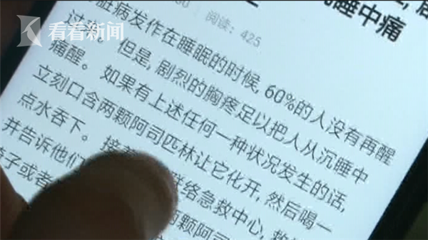 曹先生的儿子小曹说,吃完阿司匹林以后,曹先生前胸到后背撕裂一样的痛,喘不过气,痛得满头大汗。