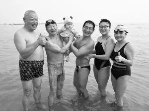一家四代五口和93岁高龄的丹东冬泳创始人程源泉先生(左二)海中畅游。