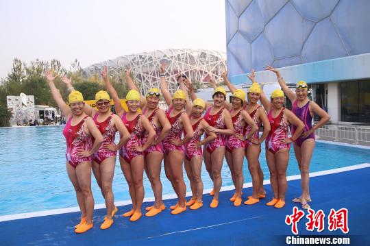 11月9日,2017年水立方冬泳系列活动在北京启动。图为参与活动的冬泳爱好者们在泳池边合影留念。 韩海丹 摄