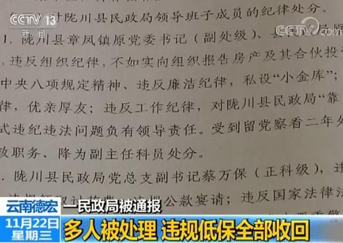 调查发现,陇川县民政局56名干部职工中,有40名领导、干部职工的82名亲属不符合享受城乡低保。而部分领导干部职工的配偶及直系亲属,违规享受低保资金已达到40.5万多元。2017年7月31日,德宏州纪委对陇川县章凤镇党委书记、县民政局原局长杨恩增立案审查。