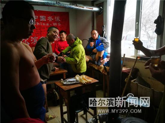 队员们换衣服的小屋墙上有一面写着“中国冬泳”的红旗,“广东郑礼伟、香港卫明、福建邹宛洪……”红旗被来哈冬泳的外地人的名字写满。“都是他们游完自己签上的,这里只是一部分,已经有一面旗子写满了,这是第二块,看来又该换新旗了。”张友庆说,每年冬天来道外这个冬泳池试水的外地爱好者都会有上百人,南到广东、台湾、香港,西到新疆、青海,东到上海、苏杭,北到黑河,全国各地的冬泳爱好者都爱上了这块冬泳池子。
