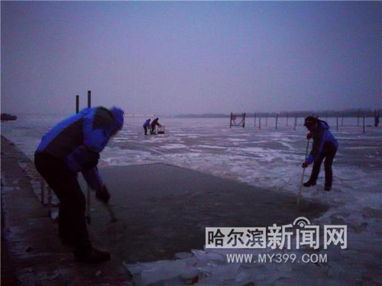 6时30分,20多人拿着工具向离岸四五十米的江面走去,那里已经打好了一圈木桩。“干活的都是我们的队员,他们现围起的才是真正的冬泳池。岸边的小池子只是临时‘热身’用的。”哈尔滨冬泳协会会长张友庆说。