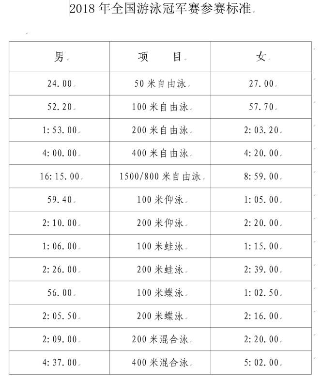 2018年全国游泳冠军赛参赛标准