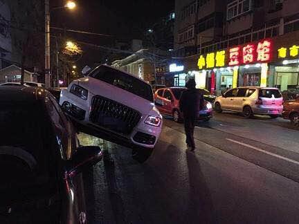 据知情者称,奥迪车是为躲避路中间的一名行人,紧急转向,于是踩着路边第一辆黑色私家车屁股就上去了,在与第二辆私家车中间停了下来,但第二辆私家车由于惯性,又顶上了第三辆私家车尾部。好在事故中没人受伤。