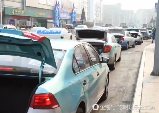 12月2日,大连一商圈路边,一排等客的出租车排起长龙,只见司机全都把后备箱打开,令路人十分费解。