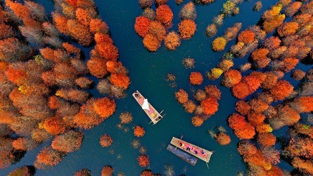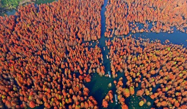 安徽红杉林有千亩水杉生长,在这个季节,红山换上新装,堪比北疆的喀纳斯风光。