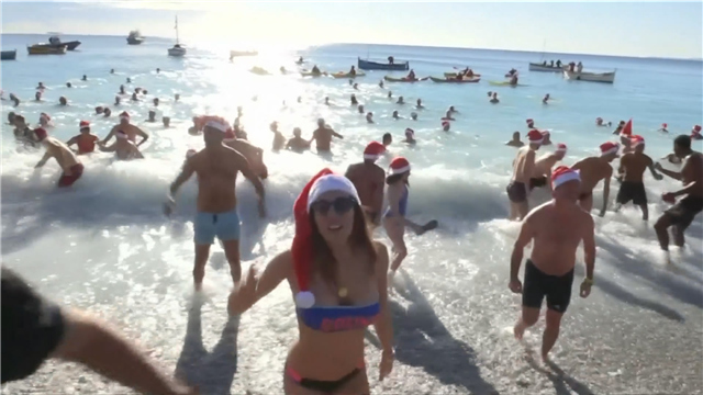 在法国东南部城市尼斯,当地民众以挑战冬泳的方式迎接圣诞。当地时间12号,大约有200人戴着红色圣诞帽,光着身子跳进冬天的地中海。尽管海水只有14摄氏度,但丝毫没有影响到他们的热情。