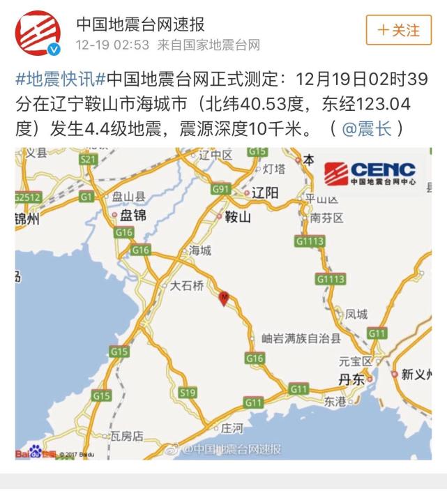 中国地震台网正式测定:12月19日02时39分在辽宁鞍山市海城市(北纬40.53度,东经123.04度)发生4.4级地震,震源深度10千米。