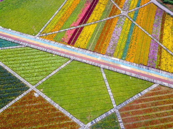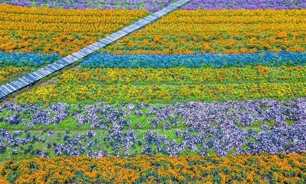 花田小镇里,醉蝶花、千日红、粉黛乱子草、格桑花、万寿菊、鸡冠花……他们含苞欲放,有如上帝遗忘在大地上的一件拼布外衣,真是是怎么拍怎么美!